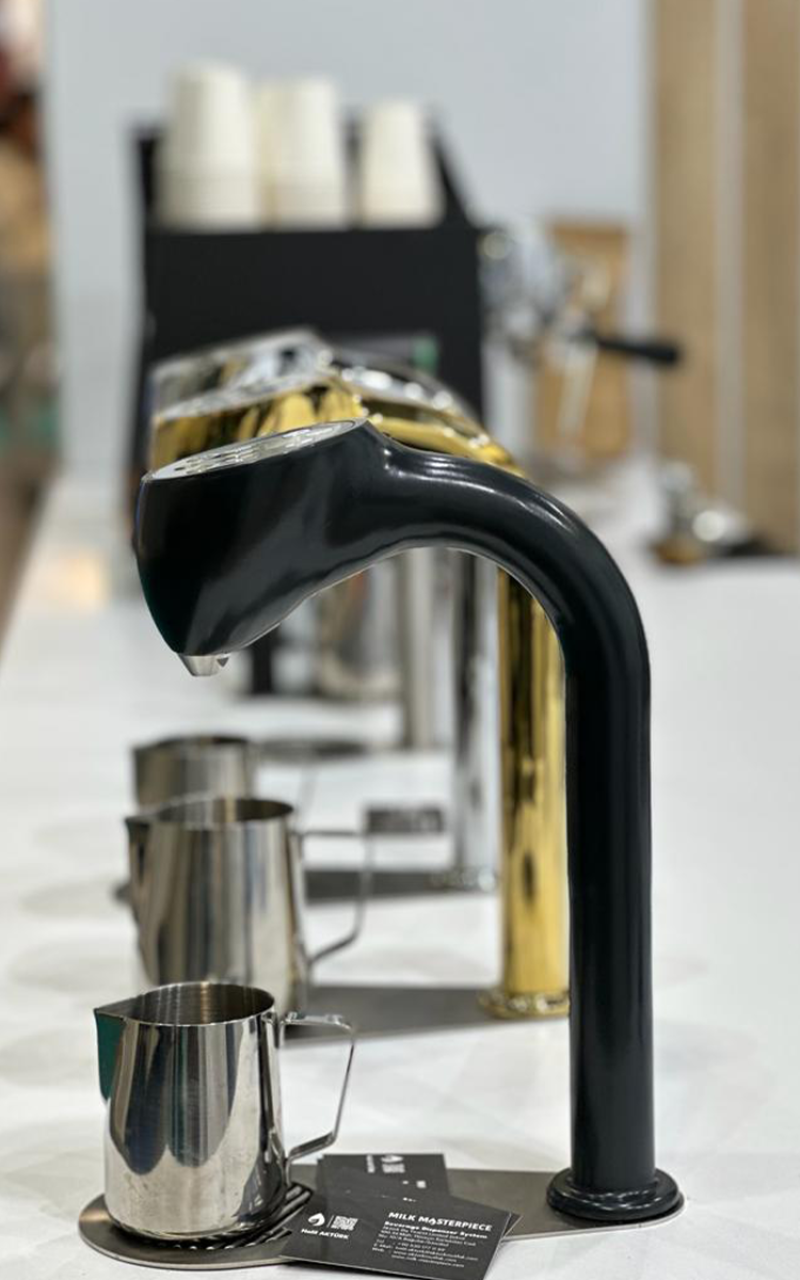 It is a modular and flexible milk and beverage dosing device for your cafe, roasting workshop, restaurant, hotel bar. Our modular and flexible design fits seamlessly into your space without sacrificing performance. 99% of the machine is under the counter to save space. Milk Masterpiece minimizes common touchpoints and is easy to clean and sterilize.